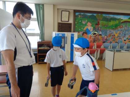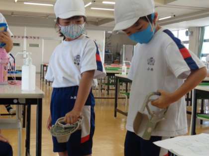 力を込めてがんばる子供たち。待ち時間にはリーダーと指相撲や腕相撲する姿も。一緒に活動して仲が深まってきたようです。終わった後教室で、「6年生は優しかった?」と聞くと「すごーく優しかった!」ときらきら笑顔の1年生でした。