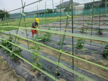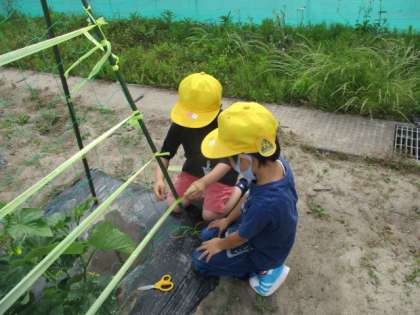 【2年生】私たちの野菜畑 公開日 2021/06/11 更新日 2021/06/11 2年生 生活科の学習で、野菜をカラスなどの鳥に食べられないようにするために考えたことをグループに分かれて行いました。1つめに、ひもを張るグループの友達です。風で飛んでいかないようにきつく結ぶのを頑張っていました。