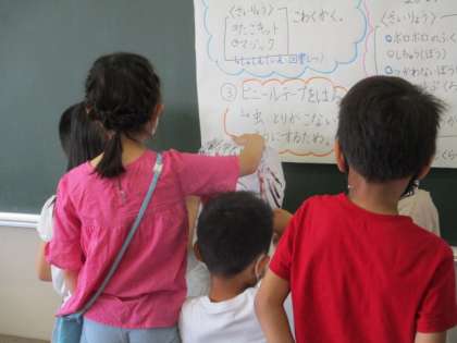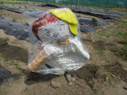 2つめのグループはかかしを作りました。先生が持ってきた服は残念ながらサイズが合いませんでしたが、お友達が持ってきてくれた服はぴったりでした。顔のところと腕のところは新聞紙をビニール袋につめて工夫して作っていました。