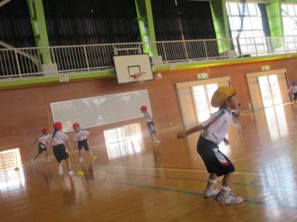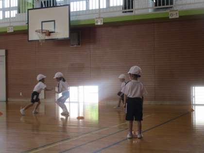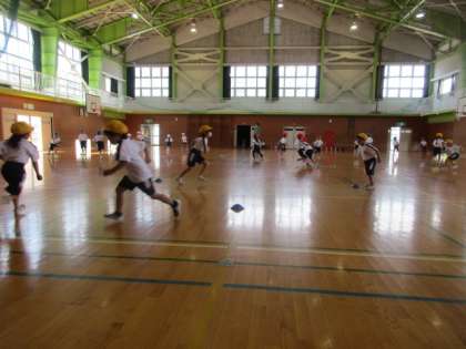 体育の様子です。今日は「しまおに」「ぐるぐるおに」をしました。細かい動きで相手をよく見て走りました。