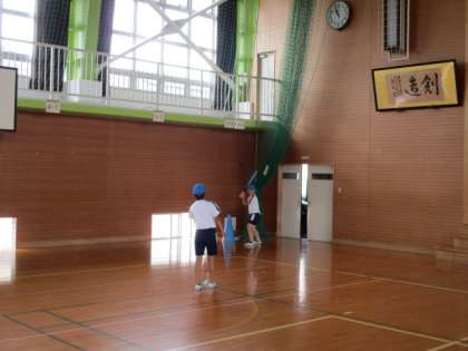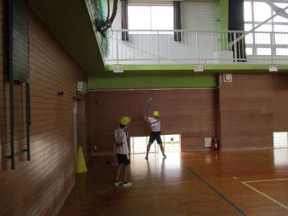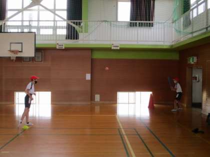 体育の学習では、ベースボール型ゲームを始めます。昨年度は止まったボールを打っていましたが、今年度はレベルアップ。ピッチャーが優しく投げたボールを打ちます。バットやラケットを上手に使い、打っていました。