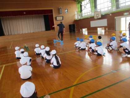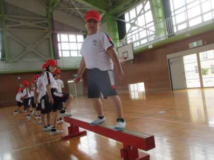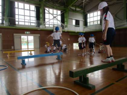 体育の学習で平均台を使ってバランス感覚を鍛えました。まっすぐ前を見て歩いたり、横を向いてカニさんで歩いたり、手をついたお猿さん歩き、片足でけんけんをして平均台の上を歩きました。