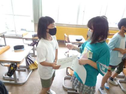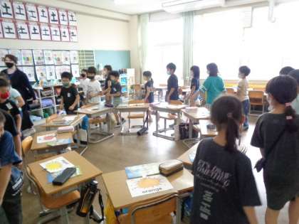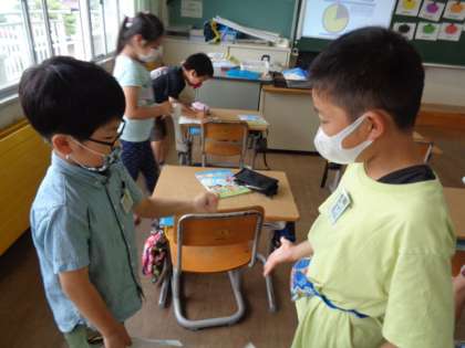 外国語活動では、ゲームをしながら色に親しみました。体を動かしながら覚えた色を友達に伝えていました。