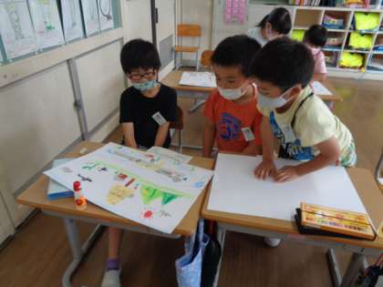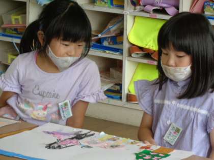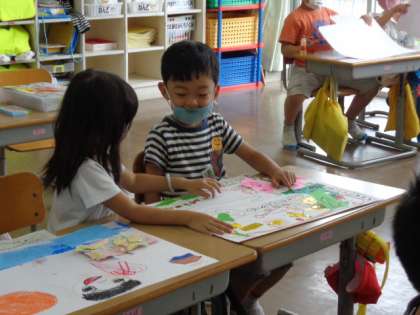 破ったりちぎったりした紙を使って絵に表しました。お互いの作品のすてきなところを褒め合いました。