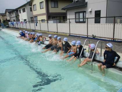 プール学習では、プールサイドに座ってバタ足の練習から始めました。その後列をつくって歩く『せんたくき』をしました。