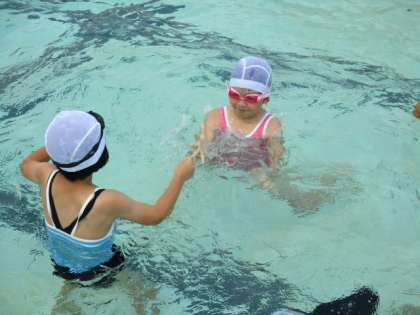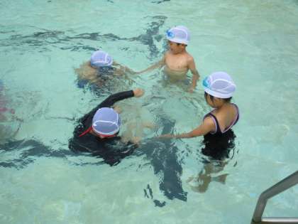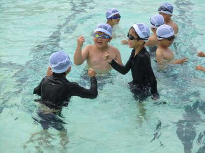 水中じゃんけんでは、水の中でバディの友達とじゃんけんをしました。顔をつけるのが苦手な子は手だけを水の中に入れてじゃんけんをしました。