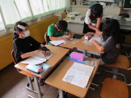 4年生は、今、算数科の学習で分度器の使い方を学習し、角度を測る練習をしています。教科書を見ながら、友達同士で分度器の使い方を話し合ったり、180°より大きい角をどのようにして測るか相談したりと友達同士で学び合う姿が見られます。