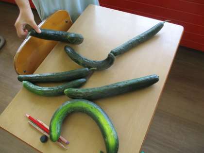 子供たちの最近の休み時間の様子を見ると、タイヤ鬼や氷鬼で遊んでいる様子をよく見かけます。また、週明けと言うことで畑に訪れるとそこにはたくさんのおばけきゅうりがありました。