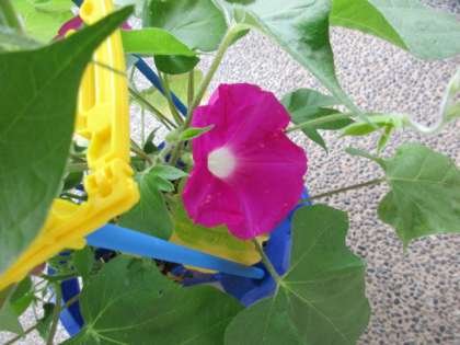 あさがおの花が咲きました。鮮やかな紫色でした。登校するなり発見した子供たちは、自分のことのように喜んでいました。ほかのあさがおたちも自分のペースでぐんぐん成長しています。