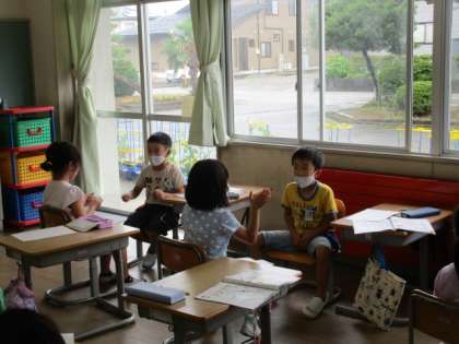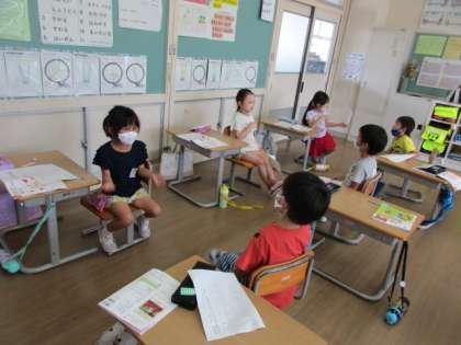 【1年生】ことばでリズム 公開日 2021/06/29 更新日 2021/06/29 1年生 音楽の様子です。「たん・たん・たん・うん」に合わせて言葉でリズムを感じました。友達のリズムをまねっこしながら楽しむことができました。