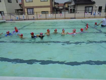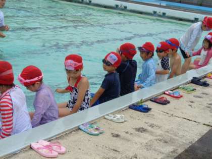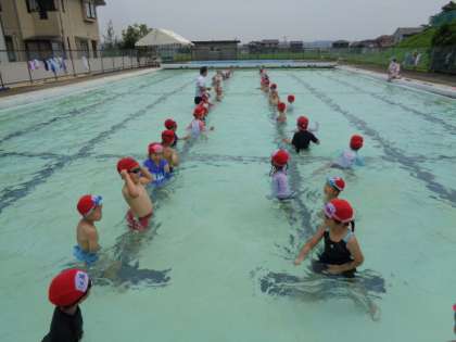 朝一番に「先生、今日はプール入れますか?」と聞く子供たち。待ちに待ったプールです。友達と手をつないでジャンプしたり、ねことねずみの追いかけごっこをしたりと水を楽しんでいます。