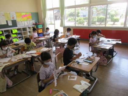 【1年生】おってたてたら 公開日 2021/07/01 更新日 2021/07/01 1年生 図工の様子です。紙を折って立ててみて、いろいろなものを作りました。紙を折る向きを工夫したり色鉛筆で楽しく色を塗ったりすることができました。来週完成予定です。