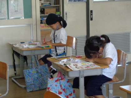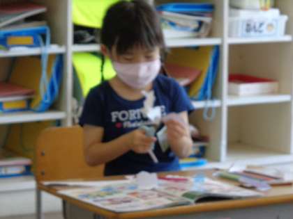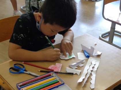 紙を折って立てると、いろいろなものに見えてきました。今日ははさみを使って上手に形を切り抜き、模様をつけました。