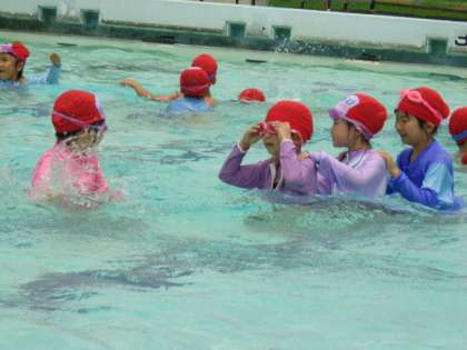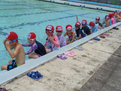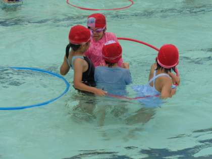 ペアで手をつないで「カニ歩き」をしたり、みんなでつながってじゃんけん列車をしたり、「猛獣狩りに行こうよ」でフラフープの中に潜って入ったりと、遊びながら楽しくが学習する子供たちです。暑い日だったので、水の冷たさが気持ちよかったようです。