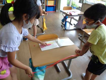 教室のいろんなものの長さを紙テープに写しとって比べてみました。
