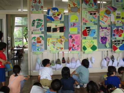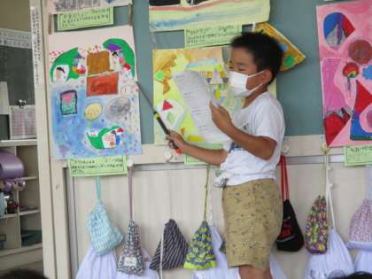 図工の時間に『ふしぎなたまご』の鑑賞会をしました。お友達の作品のいいところを見つけてワークシートに記入し、発表しました。