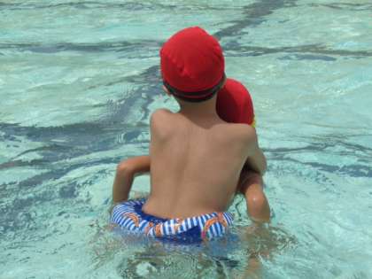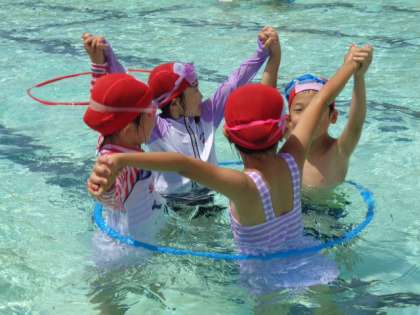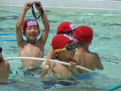 朝は雨模様でしたが、雨も止み、気温もぐんぐん上昇してきたのでプールに入ることができました。子供たちは友達と一緒に仲間づくりをしたり、おんぶをしたりと楽しく活動しました。水の中では軽くおんぶできることに驚いていてとても可愛かったです。