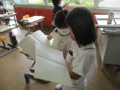 国語の学習で「あったらいいな、こんなもの」がスタートしました。今日はあったらいいなと思うモノを考えてノートに書き出しました。『宿題やってくれーる』や『じゆうえんぴつ』、『かたづけロボット』などすてきな発想がありました。書いたノートを持ってお友達と意見交流をしました。