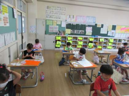 【1年生】おってたてたら 公開日 2021/07/08 更新日 2021/07/08 1年生 図工の様子です。「おってたてたら」の作品を完成させました。紙をたてるためによく考えながら作品作りに取り組んでいました。