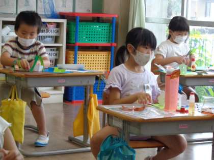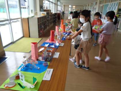 【1年生】図工 公開日 2021/07/08 更新日 2021/07/08 1年生 紙を立てるとどんどん町ができてきて、子供たちは大喜びでした。ワークスペースに36人の素敵な作品が並び、お互いにじっくりと見合っていました。