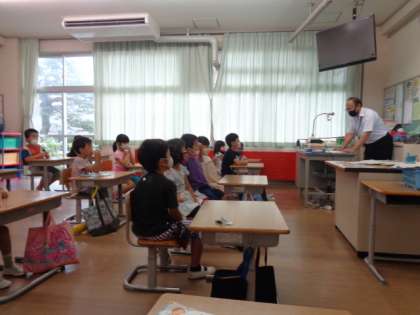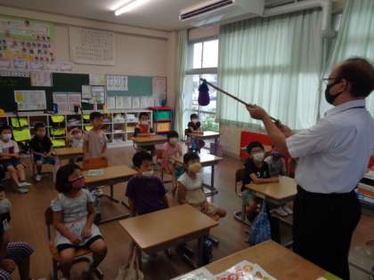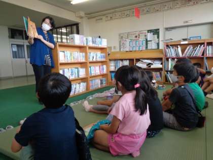一本の揺れる丸太で向かい合うウサギとキツネのお話を読んでいただきました。子供たちは物語に引き込まれて真剣に聴き入っていました。