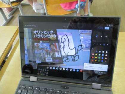 タブレットを利用して、アンケートや課題に答える方法と撮った写真に絵を描く方法を学びました。