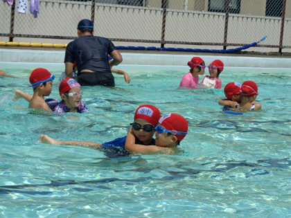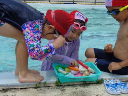 ペアじゃんけんでおんぶやお姫様だっこをしたり、みんなで宝探しをしたりと子供たちはとっても楽しく水に親しんでいます。「初めて潜れるようになった!」とキラキラの目でお話ししてくれる子供たちがとっても可愛いです。