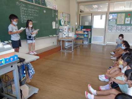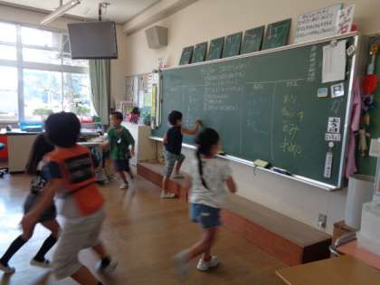1学期終わりのごほうび集会をしました。「チョークリレー」「フルーツバスケット」でみんなで楽しみました。全員揃って集会できたことが嬉しかったです。