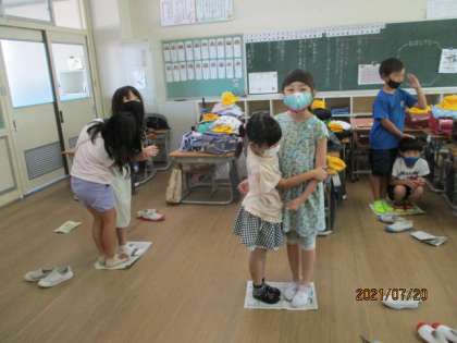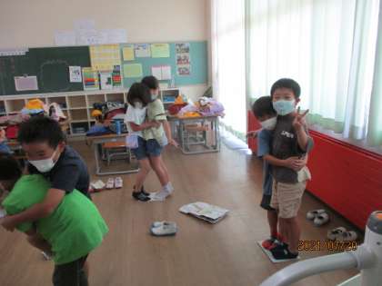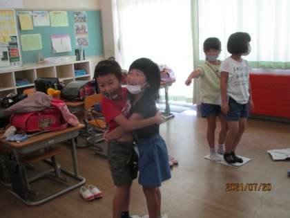 一人で行った次は、近くの人とペアになって行いました。ペアの人と協力しておんぶをしたり抱き合ったりして二人でバランスを取っていました。
