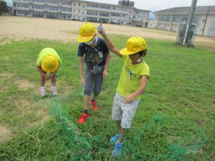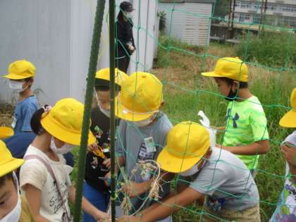 生活科で、育てた夏野菜も収穫を終え、そろそろ片づける時がやってきました。子供たちは名残惜しそうではありましたが、何か自分のできることはないか考えて、進んでキュウリの支柱や網を片付けていました。