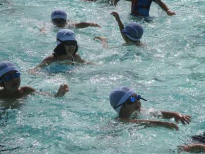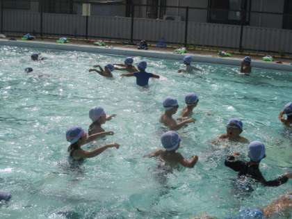 【2年生】プール 公開日 2021/08/31 更新日 2021/08/31 2年生 今日は、一組二組合同で、プール学習のまとめをしました。二人組になり、「ぶくぶくぱー」、「だるまうき」、「けのびキック」ができるかを確かめ合いました。