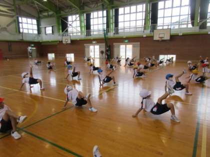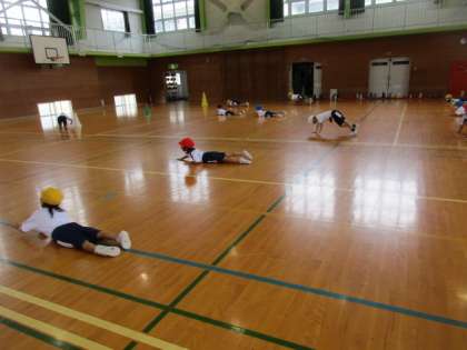 今日の体育では、イヌ、クマ、クモ等いろいろな生き物になりきって、様々な動きにチャレンジしました。
