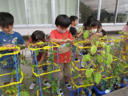 今日は、自分のあさがおにたねができているか探し、たねとりをしました。中に入っているたねの数も違えば、大きさやかたさも違い、みんな驚きながら夢中にとっていました。