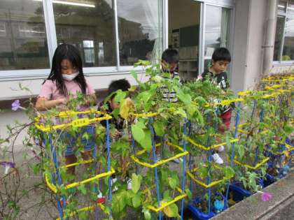 子供たちが夏休みにあさがおを観察して発見したことを話し合うと、たねができるまでの様子について、発見がたくさん出てきました。