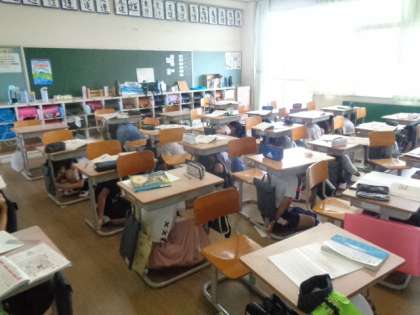 防災週間に合わせて、地震を想定したシェイクアウト訓練をしました。子供たちは、頭を守ること、机の脚を両手でもつことを訓練を通して、学んでいました。