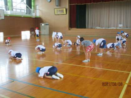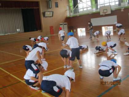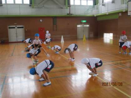 体育では、色々な体の動かし方を学習しています。今日は馬跳びに挑戦しました。子供たちは、跳ぶ人が跳びやすいように高さを変えながら全員クリアを目指して取り組みました。
