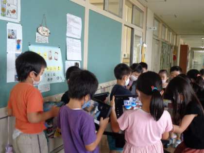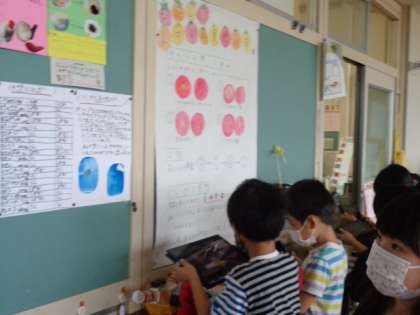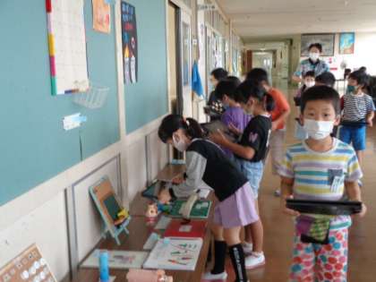 今日は、他の学年の夏休み作品を鑑賞しにいきました。子供たちは「うわぁ、すごい!」と感心しながらじっくりと作品をみてまわっていました。