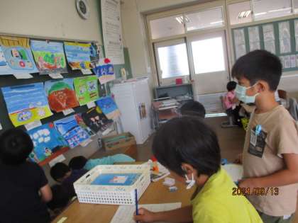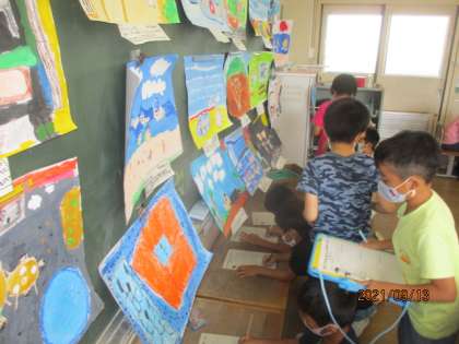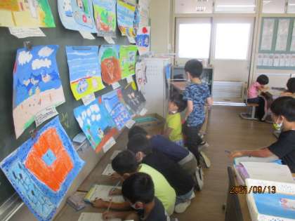 【2年生】図工 公開日 2021/09/13 更新日 2021/09/13 2年生 図工で、楽しかった夏休みの思い出をかき、今日はクラスごとに鑑賞会を行いました。友達の作品のいいところをたくさん見つけることができました。