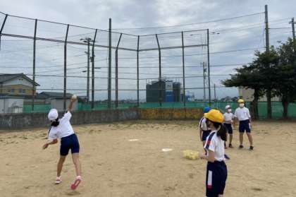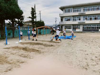校内記録会に向けて練習に励んでいます。走り幅跳びではポイントの一つ、飛ぶときの目線を子供同士が見合いました。友達から○と言われるよう、意識しています。ソフトボール投げでは、目標とするラインを決めて、そこを超えられるよう全力で投げていました。
