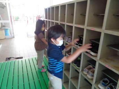 登校後自分のすることを終えた子から、全校のためになることを自分で見付けて行う「ぴかぴかタイム」を続けています。下足箱のかかとをピシッと揃えたり、積み木を片付けたりと一生懸命な1年生です。