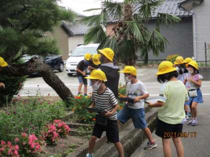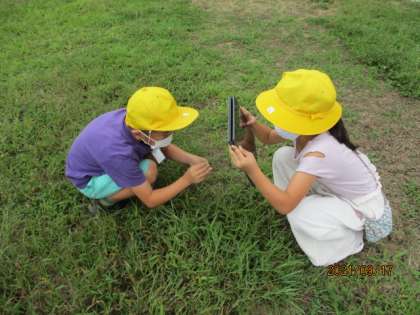 学校の周りにはどんな生き物がいるか探して写真に撮る活動をしました。ペアで写真を撮る人と虫を探す人に分かれて活動をしました。