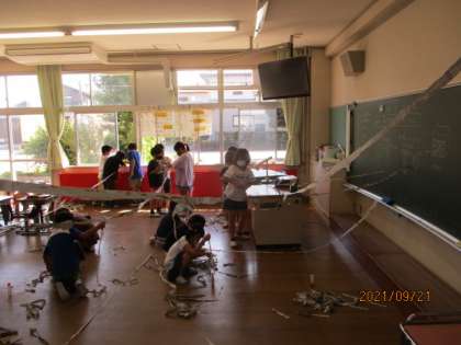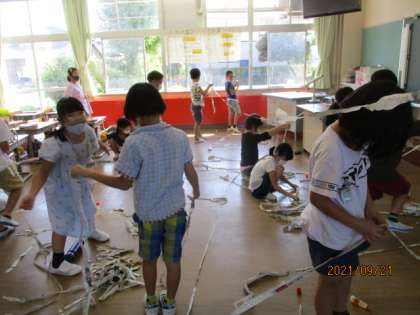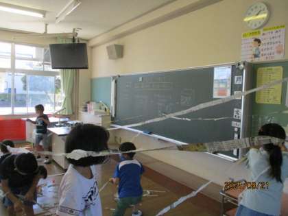 図工の学習で、ちらしや新聞紙を細く長くつなげて教室に巨大な蜘蛛の巣を作りました。