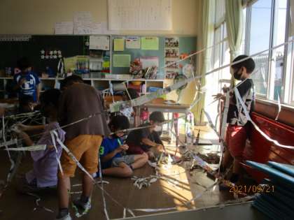 【2年生】つないで つるして2 公開日 2021/09/21 更新日 2021/09/21 2年生 制作途中の様子です。どんどんできあがるにつれ身動きがとれなくて大変でした。子供たちは、下をくぐったり、跳んだりして移動していました。