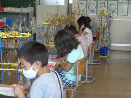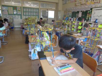 大切に育ててきたあさがおを来週リースにする予定です。今日は、久々にじっくり今のあさがおの様子を観察し、観察カードを書きました。涙をためた目で「切り取るのは悲しい」と話す子もいました。愛情をもって優しい気持ちであさがおと関わる子供の心にじいんとしました。