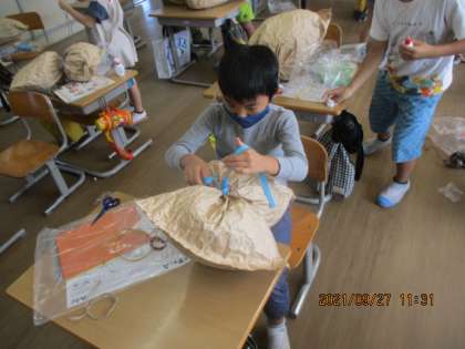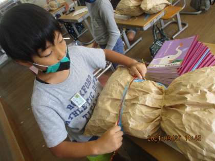 【2年生】図工 公開日 2021/09/27 更新日 2021/09/27 2年生 今日から「くしゃくしゃぎゅ」に入りました。大きな紙の袋をよくもんでくしゃしゃにして中に、ふわふわに丸めた新聞紙をつめ、口を閉じ、形を整え、動物や昆虫を作りました。