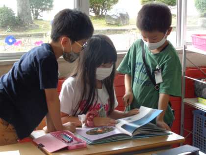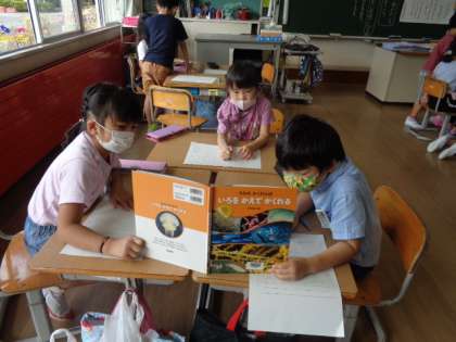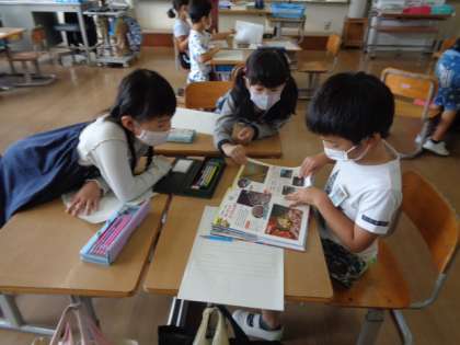 「うみのかくれんぼ」の学習で、教科書以外の海の生き物について調べて図鑑を作っています。班の仲間と一生懸命調べていました。
