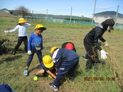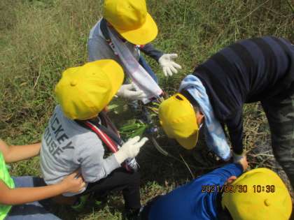 今日は、生活科で使用した畑の始末をしました。まだ、実が残っている野菜もあり、抜いてしまうのはさびしいという声が子ども達からは聞かれました。大きくなったたオクラなどは四人がかりで抜いたり、マルチを片付けたりするなど、汗をかきながらよくがんばりました。来週はもう一時間片付けを行う予定です。