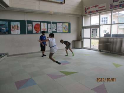 【2年生】チャレンジ技7に挑戦! 公開日 2021/10/01 更新日 2021/10/01 2年生 なかよしタイムに体育委員会主催のチャレンジ技7に挑戦をしました。今日は技2の跳ぶ運動の金シールを目指して高さ60センチメートルのゴムを跳び越えました。見事クリアしたお友達は体育委員のお兄さんからシールをもらい嬉しそうに喜んでいました。