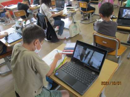 【2年生】タブレットを活用して。 公開日 2021/10/01 更新日 2021/10/01 2年生 生活科の虫の観察をタブレットを活用して行いました。育てている虫の写真を撮ってその写真を拡大することでじっくり観察することができました。数日間育てた虫は土日を前に自然にかえしました。