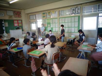 【5年生】稲刈りの振り返り 公開日 2021/10/05 更新日 2021/10/05 5年生 総合の学習の時間に、稲刈りの感想や気付いたことを一人ずつ発表しました。実際に体験をして、昔の人の苦労や大変さを発表していました。発表の後、拍手が起こっていたのは素敵な一面でした。